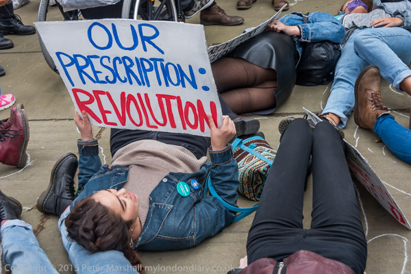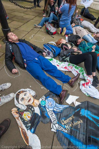 Florence Nightingale and Anthony of Bursary or Bust at die-in. Shut down Geaorge Osborne Shut Down Jeremy Hunt