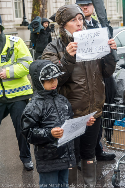 People meet up at Downing St. A poster says Labour Council's 'Regeneration' of working class estates makes people homeless!