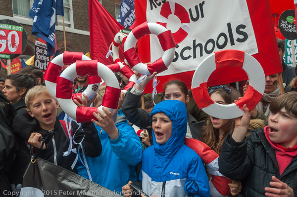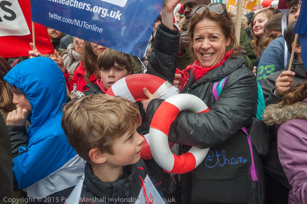 Parents and children from the 'Save Our Schools' campaign came with lifebelts
