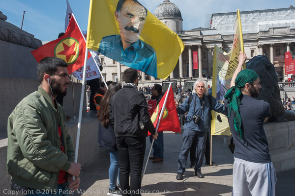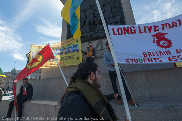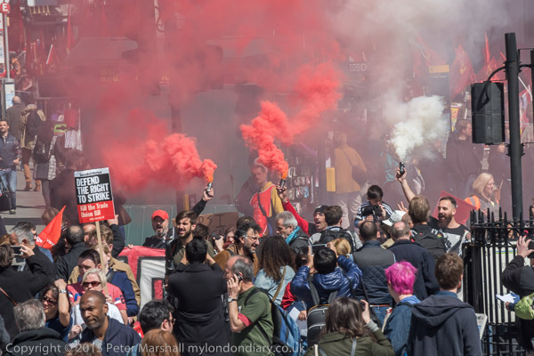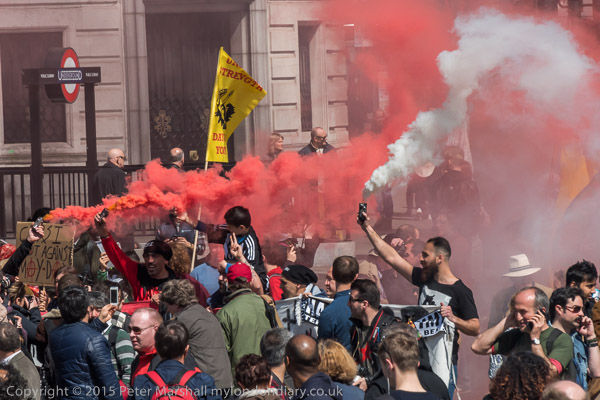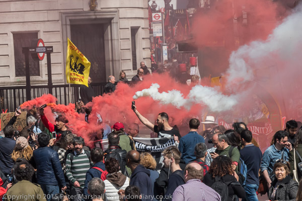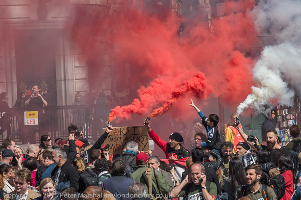 More people climb on to the plinth with their banners. They think the steward is unhinged and unfraternal and