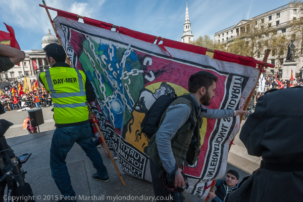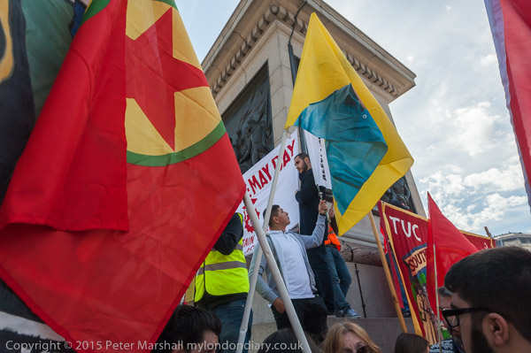 The plinth gives a clear view of the marchers entering the square with banners and flags