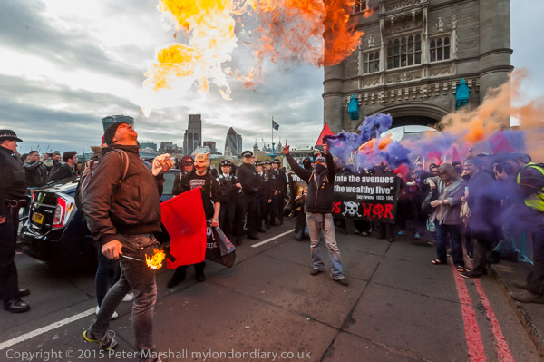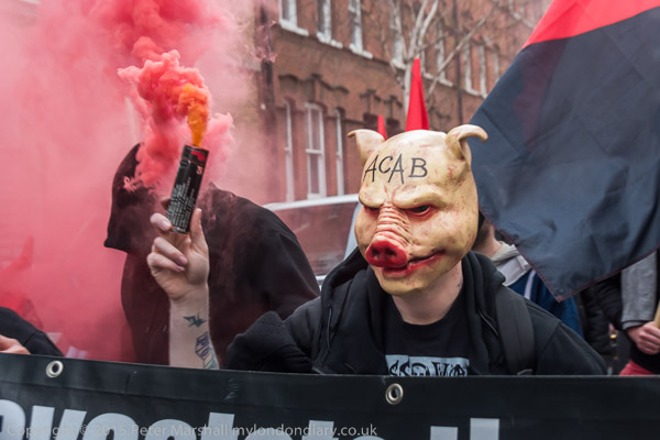Next to the terrible 'museum' the air stays fairly clearas Class War move with the Womens Death Brigade banner