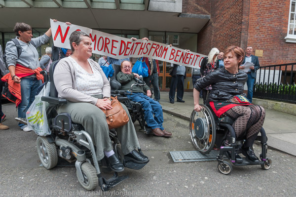 in front of Congress House with banners 'No More Deaths from Benefit Cuts'. Among them were activists from