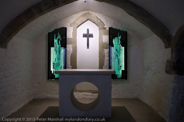 St Bride's crypt. This large crypt was rediscovered after wartime bombing and now has two chapels and a museum