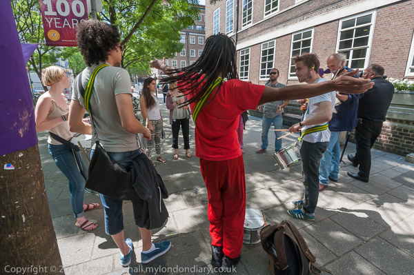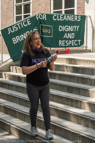 Consuelo with an air-horn in front of the Justice for Cleaners banner on SOAS steps