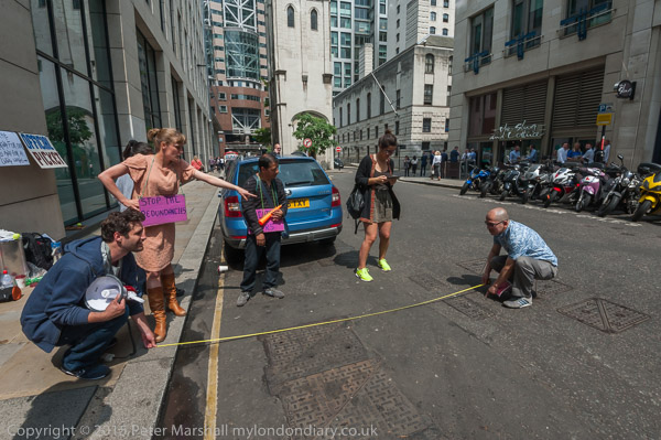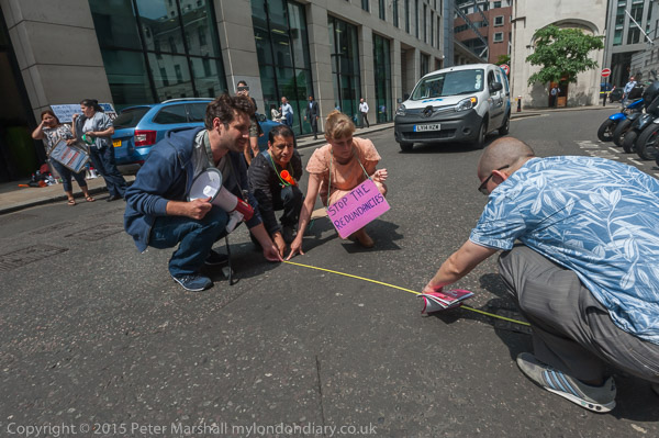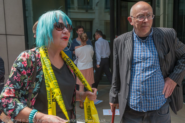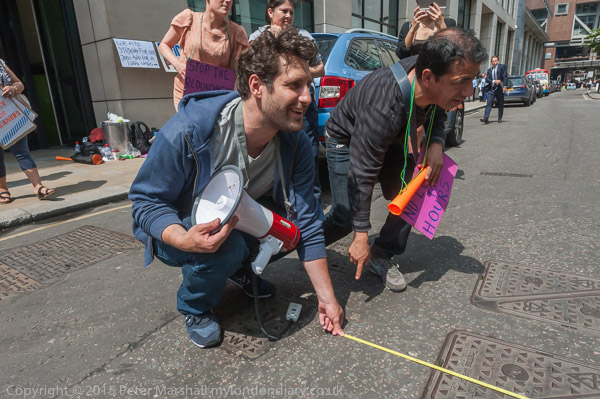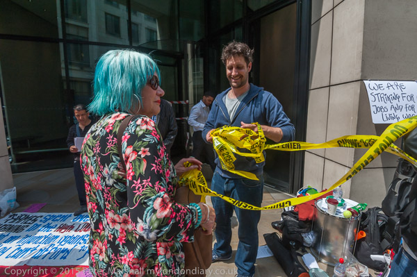 Jane Nicholl of Class War shows Petros Elia, UVW General Secretary, the 10 metre length of hazard tape