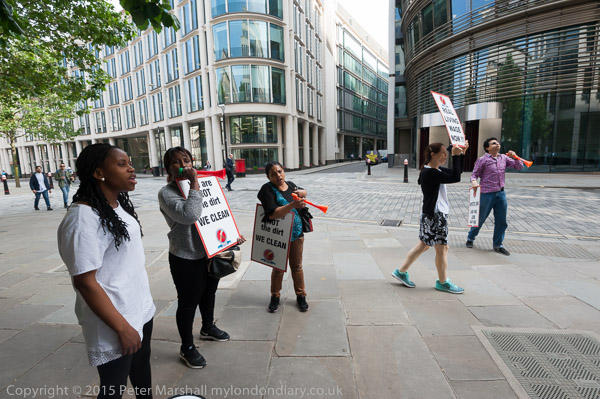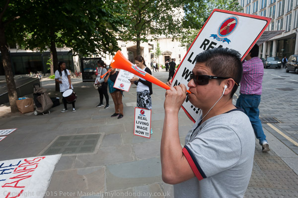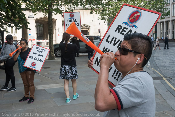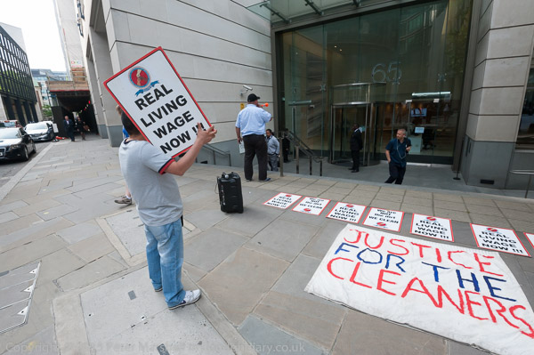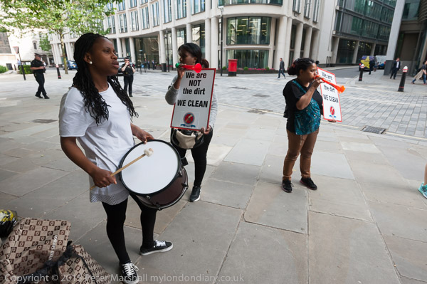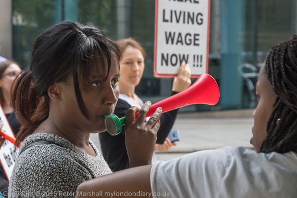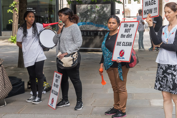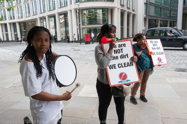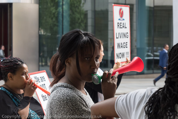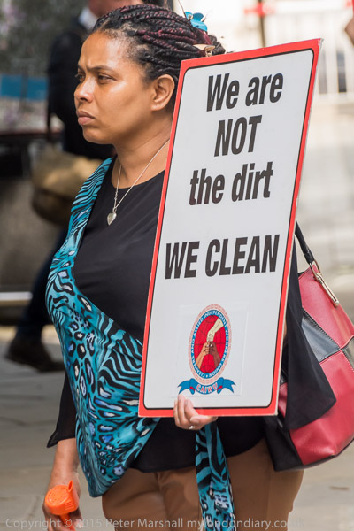 and 'Living Wage Now'. But the protest is also for the re-instatement of sacked African cleaners