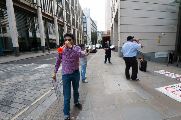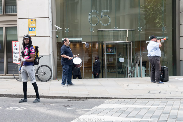 Cleaners put out posters and banners at the top of the steps leading up from 65 Gresham St, where Capita have offices