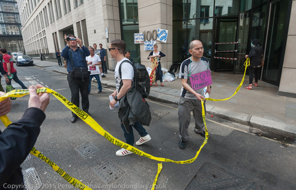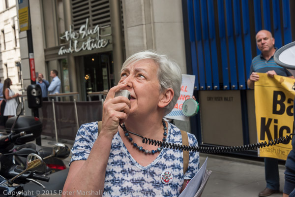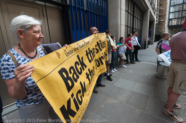 PCS rep at the National Gallery Candy Udwin holds one end of the Unite the Resistance banner