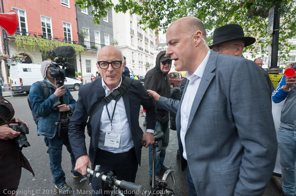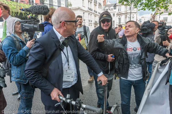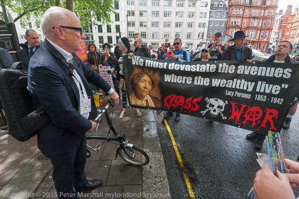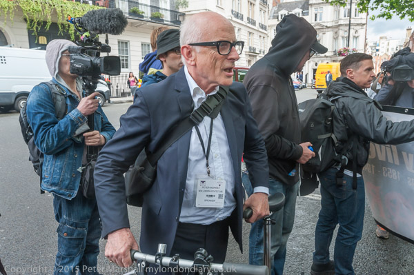 Peter Murray of New London Architecture stops briefly to look at the protest as he leaves the forum
