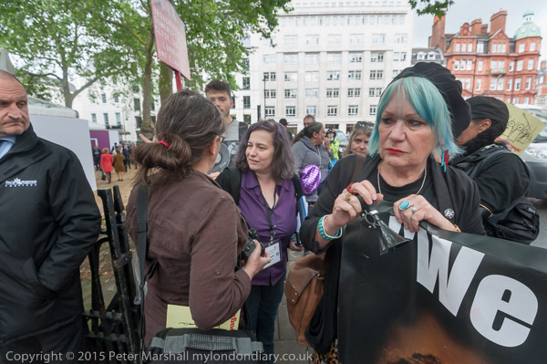 Jane Nicholl of Class War shouts and beeps her horn at people going in to the forum