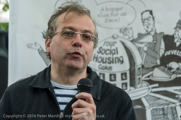 A woman holds a poster 'Market Value for Aylesbury Estate Southwark Council' as David Iles speaks.