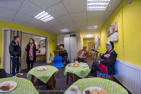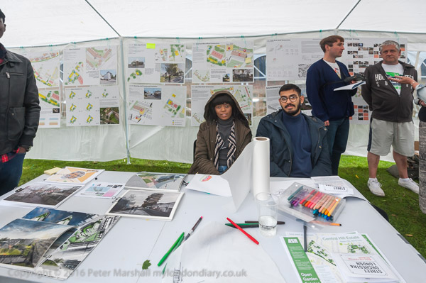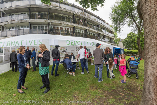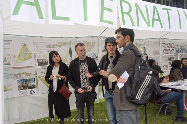 ![]() and comes up with 'Anarchy and Old Dogs' ![]() People from the estate and their views on display ![]() At left, Labour MP for Dulwich and West Norwood Helen Hayes ![]() One block on the estae houses shops and the Upper Norwood Community Resource Centre ![]() ![]() Opposite the shops is a block with a nuclear bunker at its base ![]() ![]() There was free tea, coffee and cakes for OAPs in the Resource Centre ![]() ![]() ![]() Simon Elmer of Architects for Social Housing asks Helen Hayes MP why she is at the Open Estates event ![]() when she has campaigned on the estate for the councillors who want to demolish it |