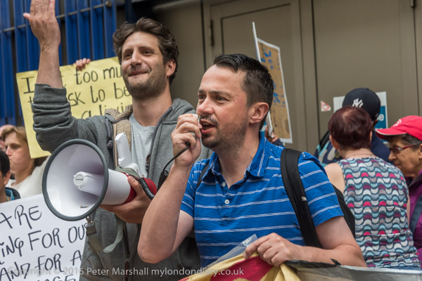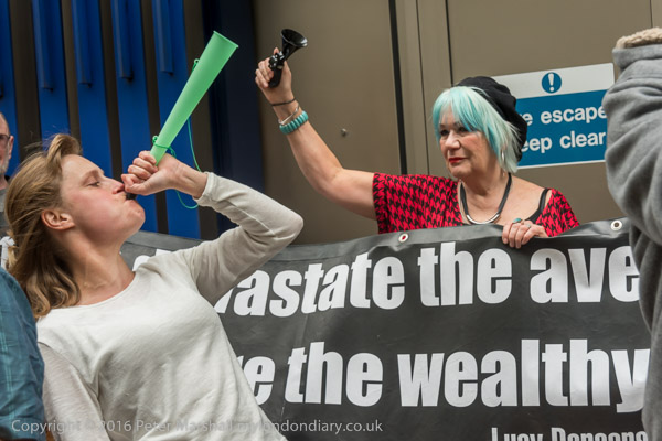 Vera from UVW blows a plastic horn and Jane Nicholl of Class War beeps her horn