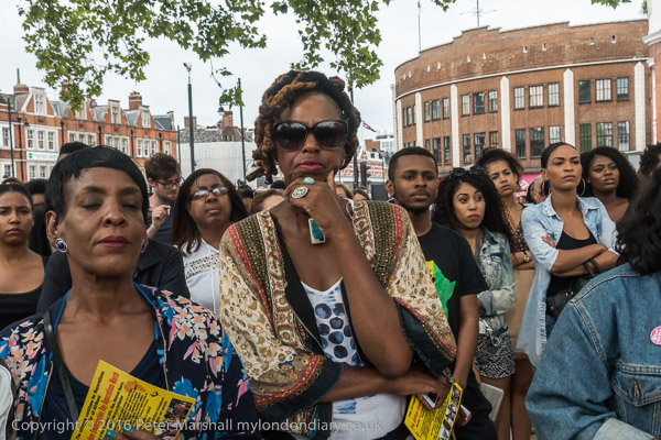 Protesters gather in Windrush Square in front of the tree that is almost the only thing left from the old Tate Gardens