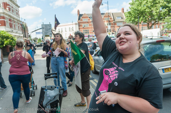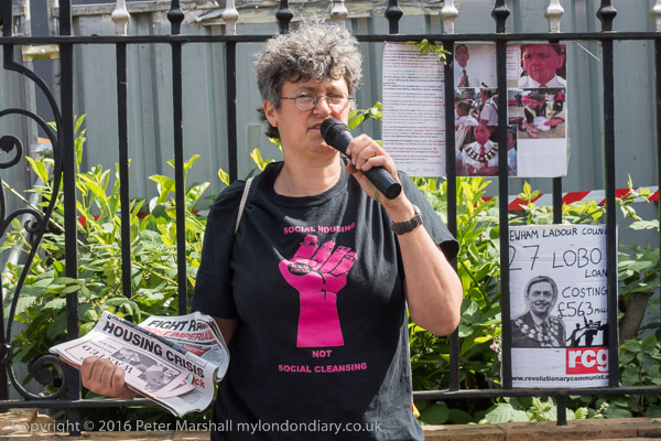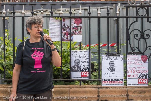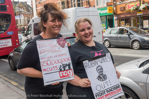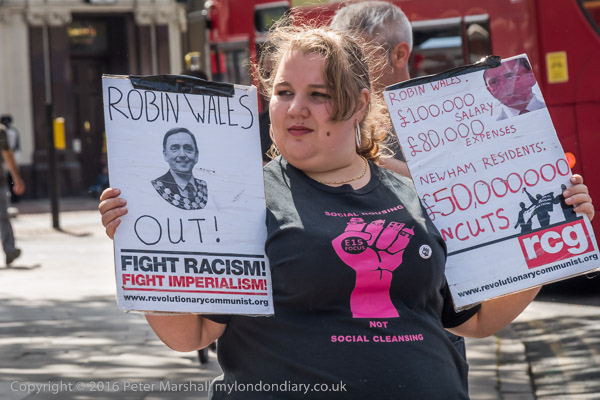 Jasmine Stone holds up a RCG poster - Newham residents suffer £50million cuts. RObin Wales gets £100,000 + £80,000 expenses