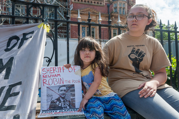 The Focus E15 protesters set up on Barking Rd, outside Newham Town Hall, with posters on its fence about