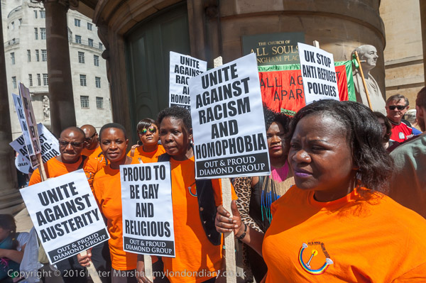Out & Proud Diamand Group with posters on the steps of All Souls Langham Place