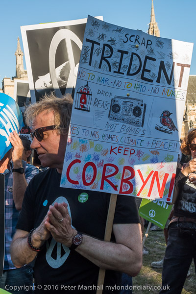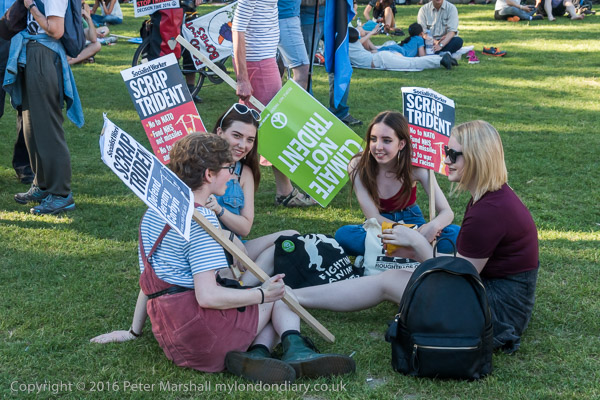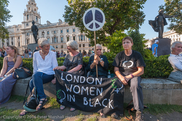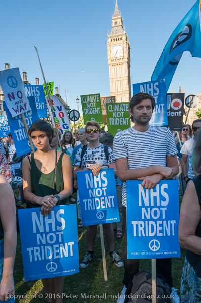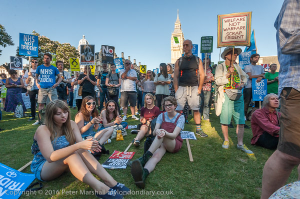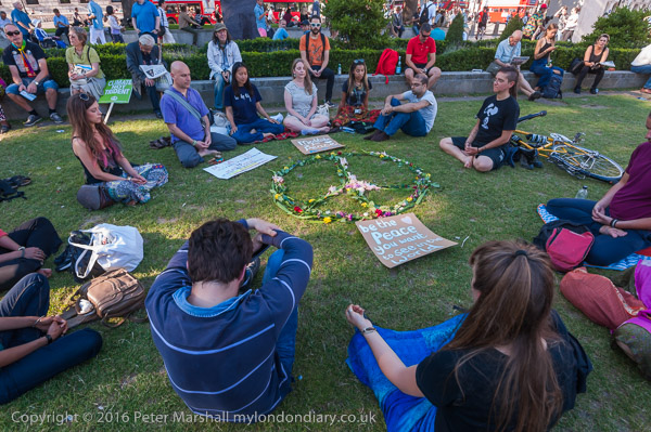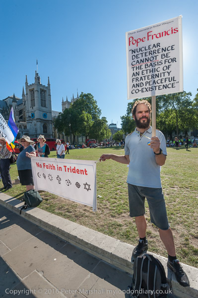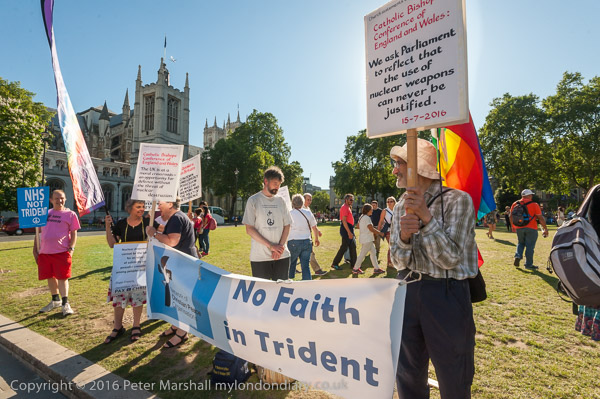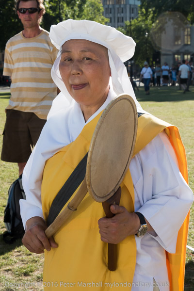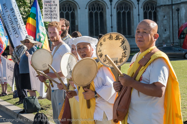 Faith protesters lined up on the edge of the square facing Parliament, including Buddhists from the Battersea Peace Pagoda