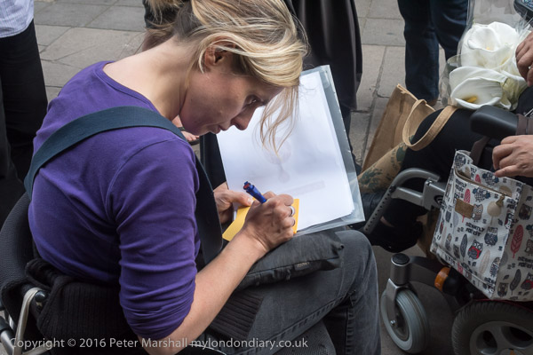 People gather a few yards from the Japanese embassy on a wider stretch of pavement