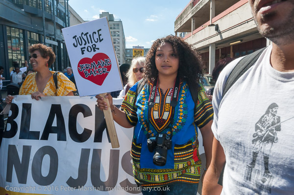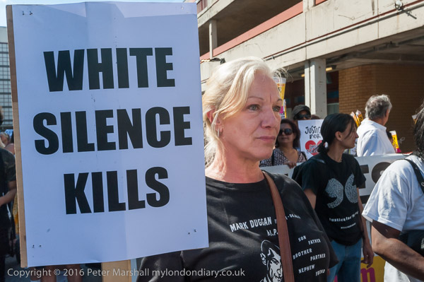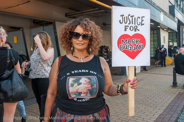 'Justice for Mark Duggan' - A woman has a picture of Duggan (aka 'Starrish M') with the message '... 5 years on ... no justice'