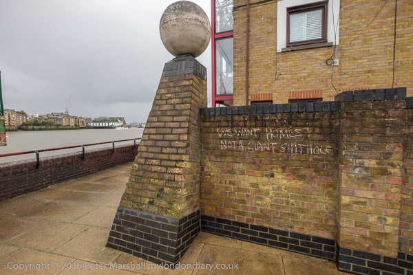 'We want homes - not a giant shithole' is presumably a comment on the redevelopment of Chambers Wharf