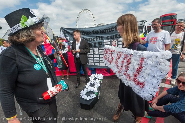 Disabled campaigners calling for an end to the sanctions and cuts in benefits that have led to the deaths of many disabled people block Westminster Bridge in a protest calling for 'No More Benefit Deaths'.