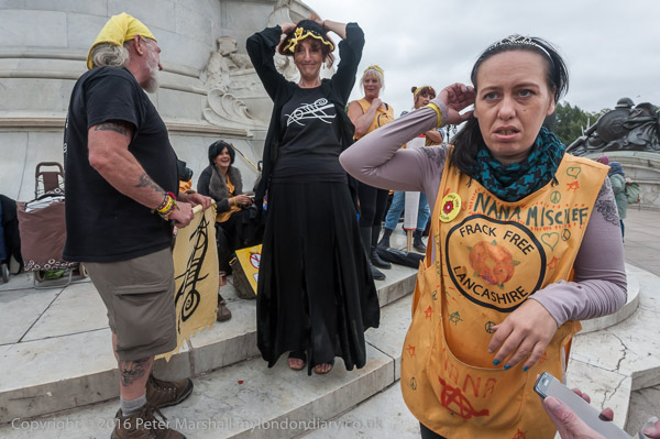 fountain oppositeIn a protest with tiaras and tabards as well as tea and scones, Lancashire's famous anti-fracking Nanas - the Nanas from Nanashire - came to Buckingham Palace to present a detailed report by Anna Szolucha on 'The Human Dimension of Shale Gas Developments, and to call on Her Majesty as the most powerful grandmother in the land to stop fracking for the sake of future generations.