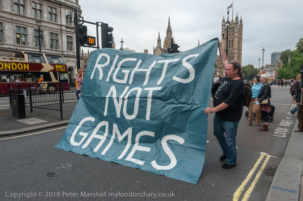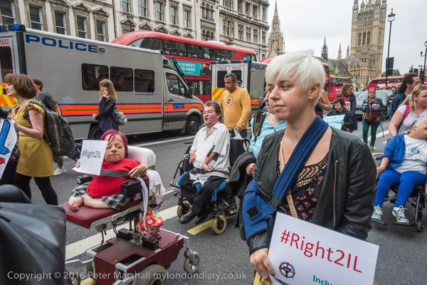 'Claire Glasman holds a poster 'Fund Independent Livinv NOT Traiden!'