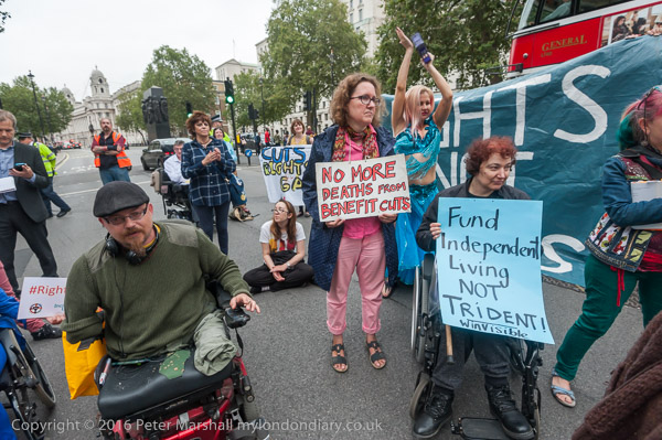 The protesters stop on the road in front of Downing St. Police direct traffic around them
