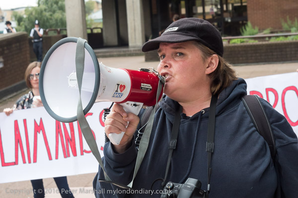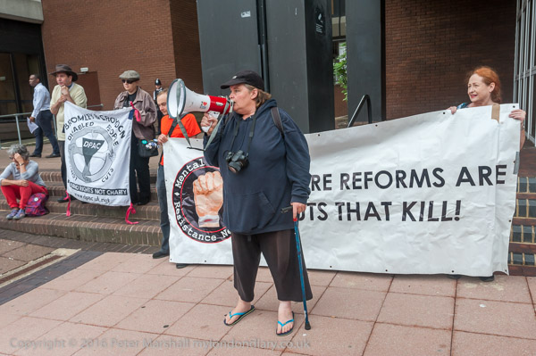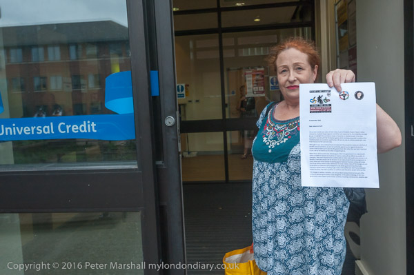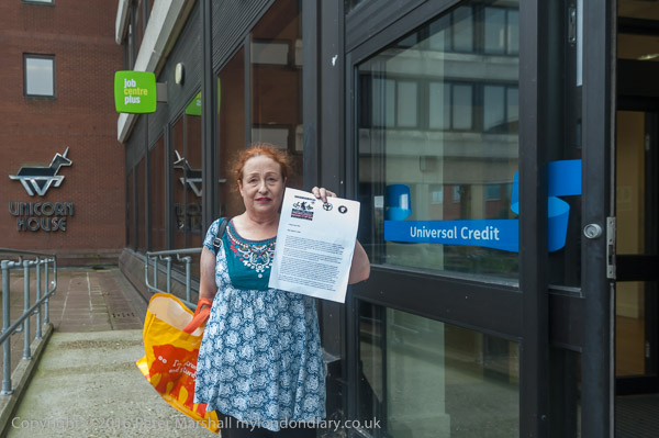 A woman from the Mental Health Resistance Network takes a letter in to the Job Centre
