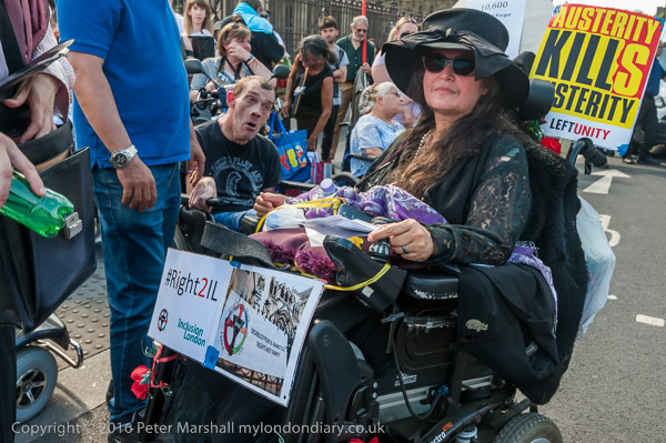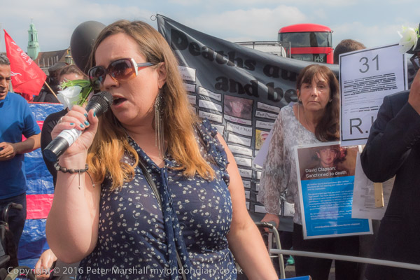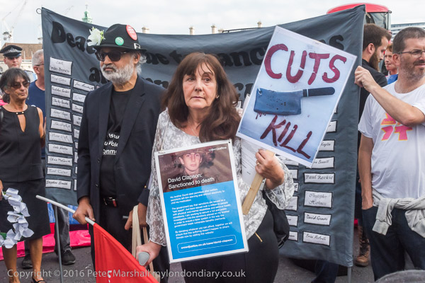 Placards give details of some who have died from benefit cuts. One woman wears an apron with some of their names. Others hold photographs of them