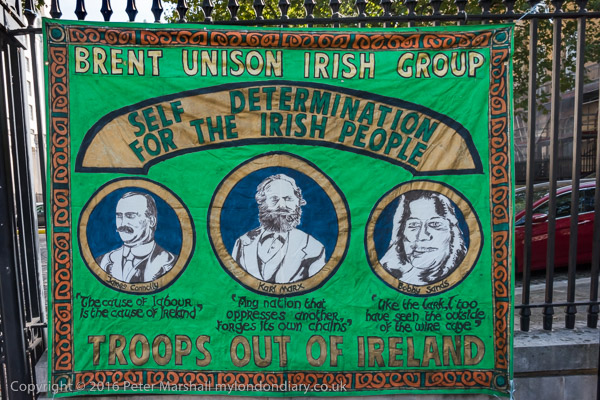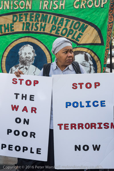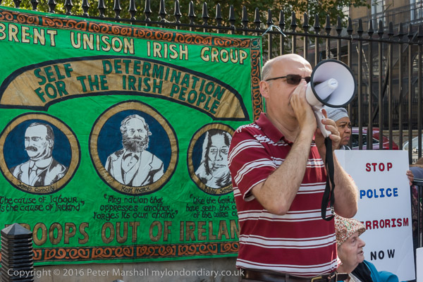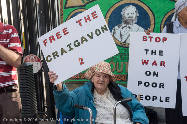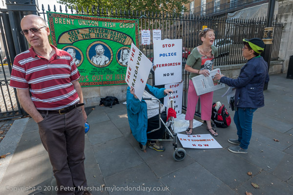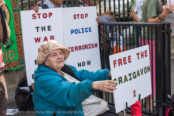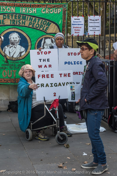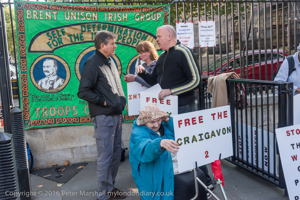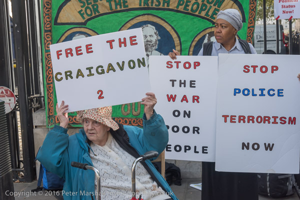 ![]() Brent Unison Irish Group banner with pictures of James Connolly, Karl Marx and Bobby Sands ![]() 'Free the Craigavon 2' ![]() 'End Internment Now' ![]() ![]() 'Stop Police Terrorism Now' ![]() ![]() 'Stop the War on Poor People' ![]() ![]() ![]() A woman holds up an Irish flag on which they have written 'Justice for the Craigavon 2' |