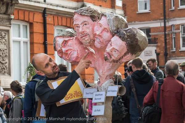 and he holds his 4-headed sculpture of the villians of Lambeth Council: Lambeth Labour leader Lib Peck, Cabinet Member for Housing Cllr Matthew Bennett, Cabinet Member for Regeneration, Business and Culture Jack Hopkins and Sue Foster, Strategic Director, Neighbourhoods and Growth.