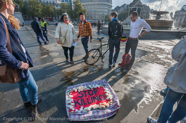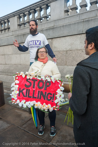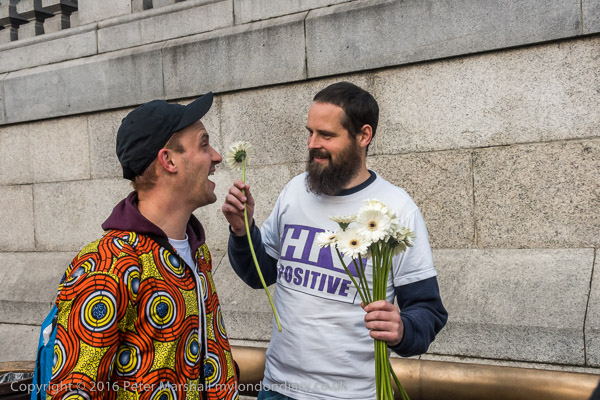 People from ACT UP London meet in the corner of Trafalgar Square