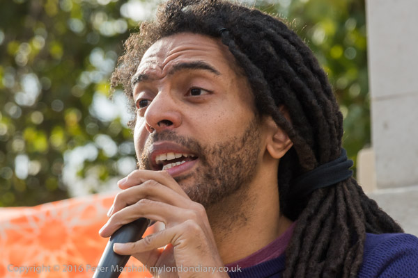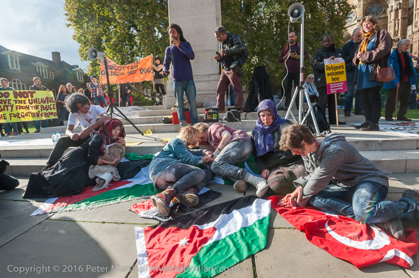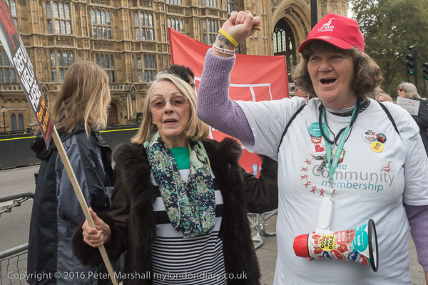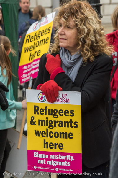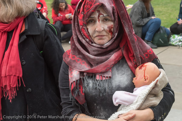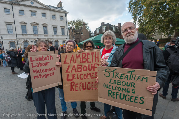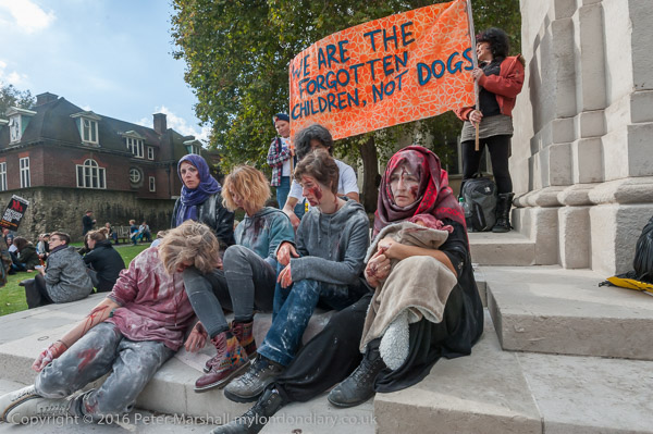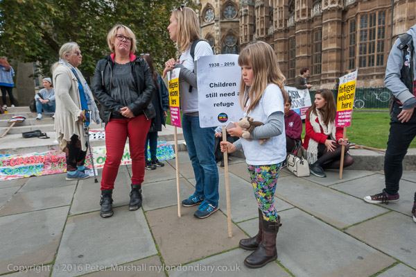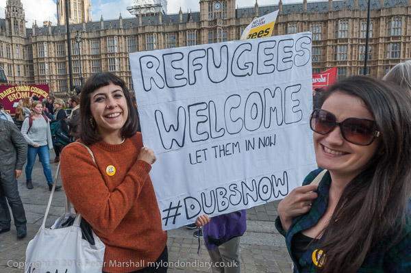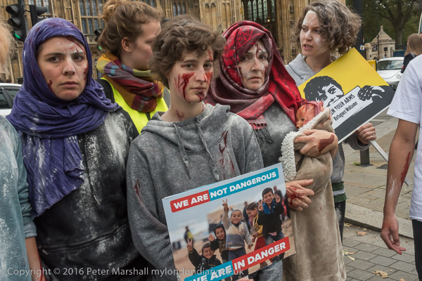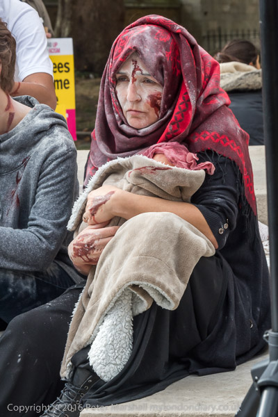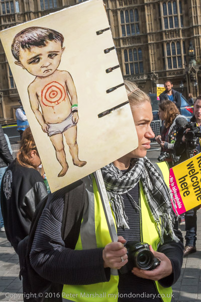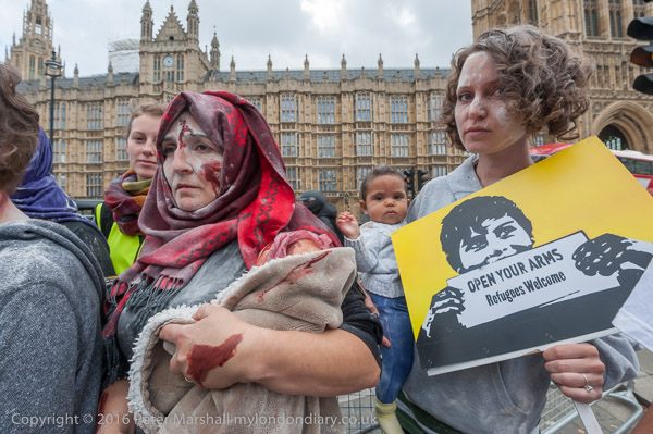 People met in Old Palace Yard in front of the Houses of Parliament, including a group dressed as refugees