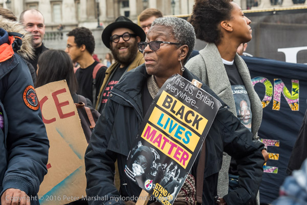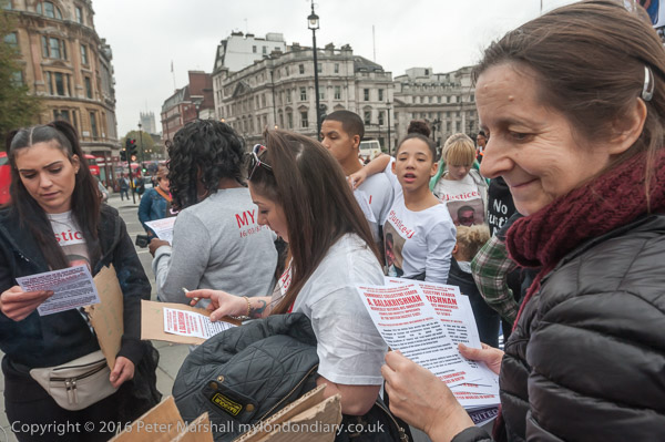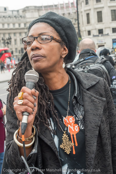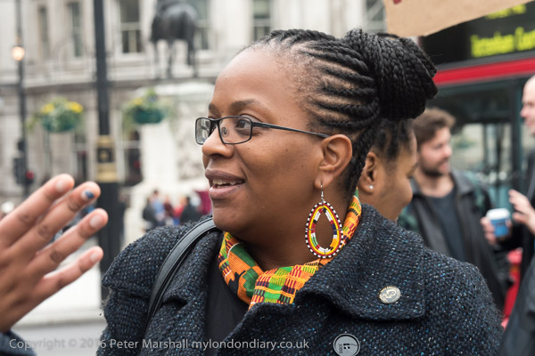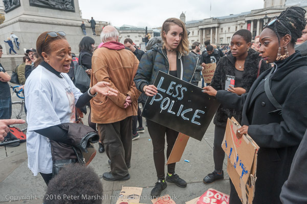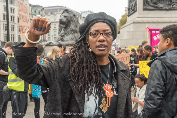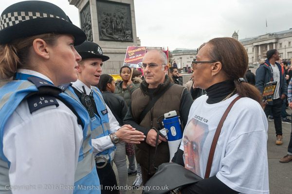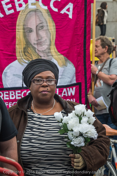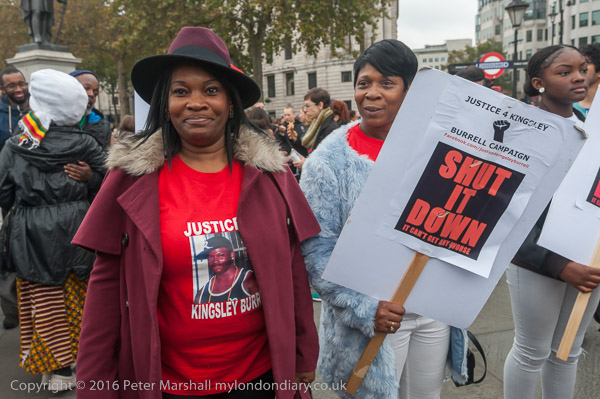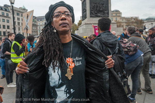 Marcia Rigg shows her t-shirt with a picture of her brother Sean, killed in Brixton Police station in 2008
