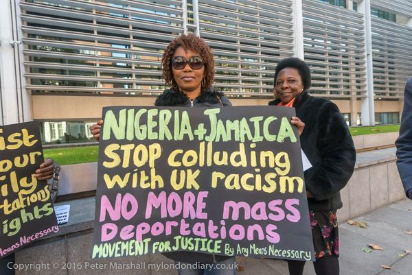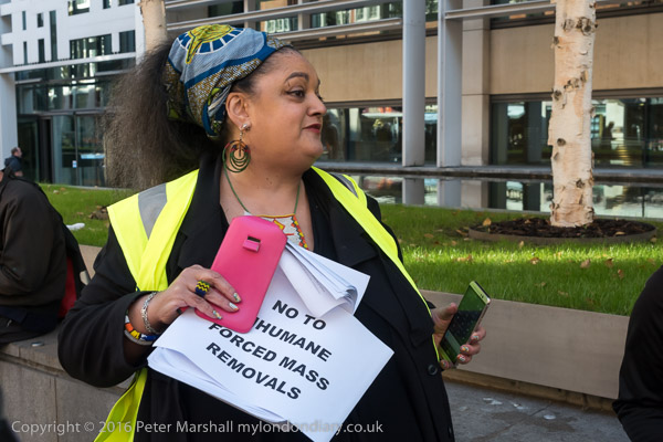 Zita Holbourne holds posters 'No to Inhumane forced mass removals'