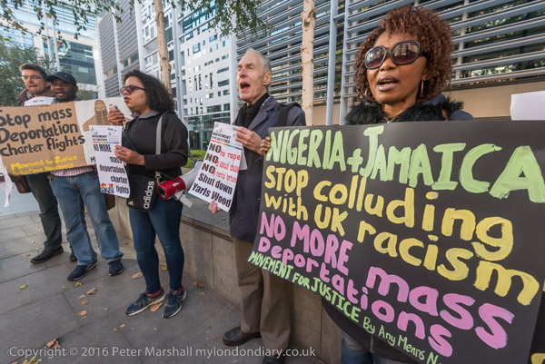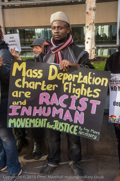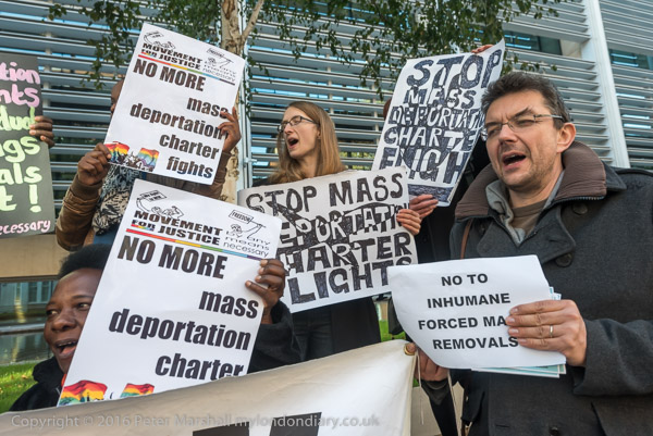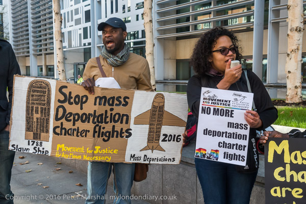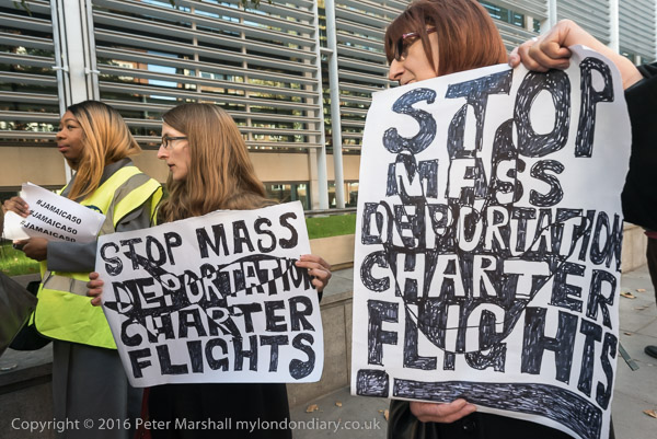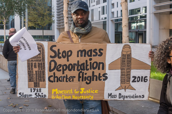 'Stop Mass Deportation Charter Flights' and an airplane