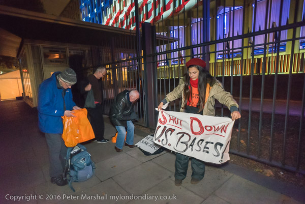 Protesters began to set up in front of the US Embassy, which was lit