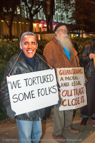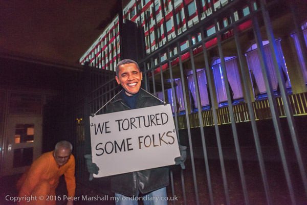 A man in an Obama mask holds a quotation from him 'We tortured some
