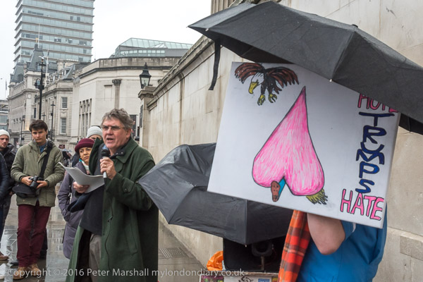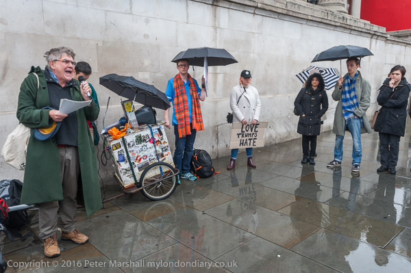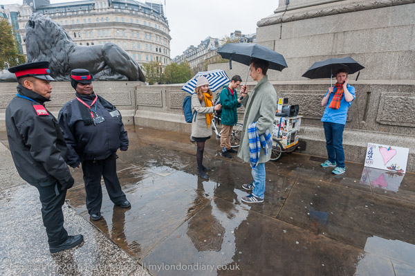 A heritage warden tells the protesters they cannot protest in Trafalgar