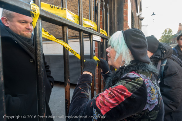A security guard inside the fence looks at Jane Nicholl as she winds