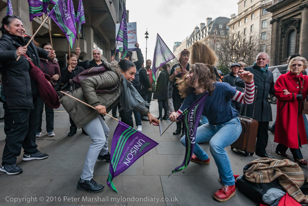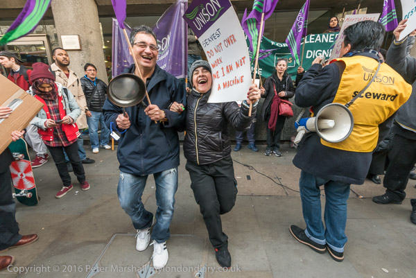 and cleaners and supporters dance outside King's College on the Strand