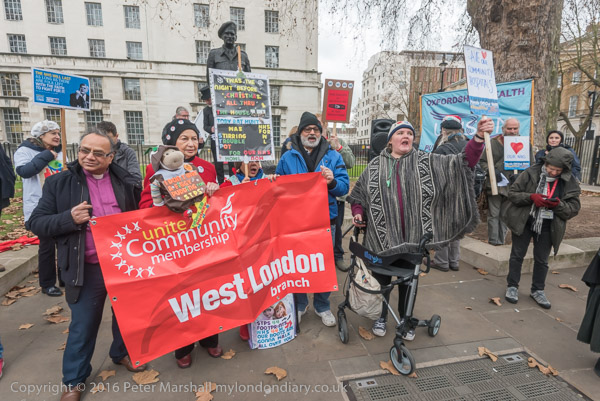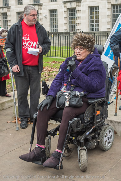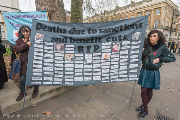 Campaigners hold a banner 'Deaths due to sanctions and benefit cuts