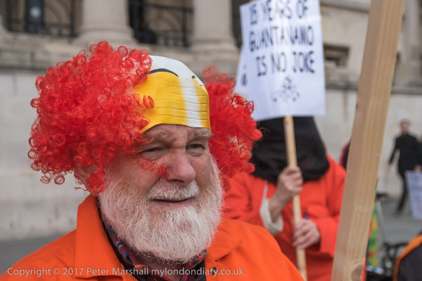 Three passing Americans put on orange jumpsuits and hoods and posed with the protesters