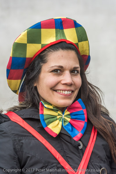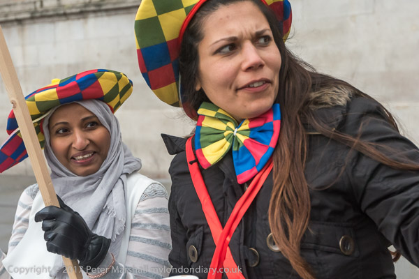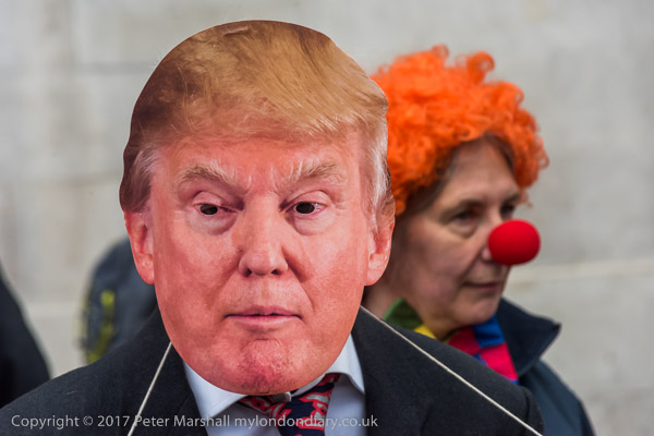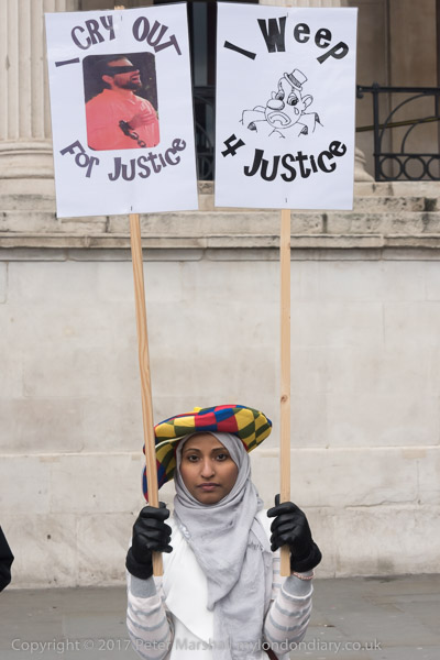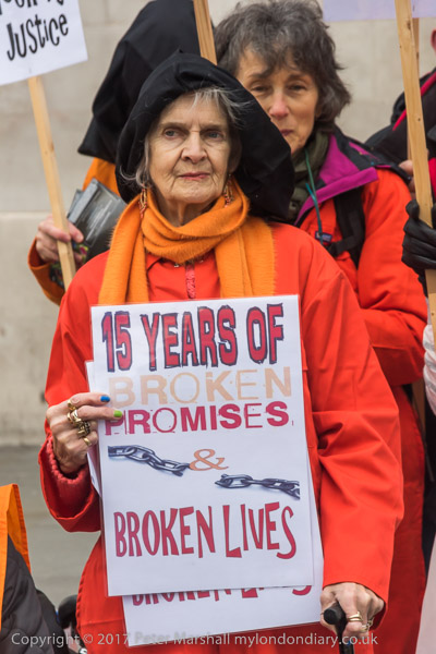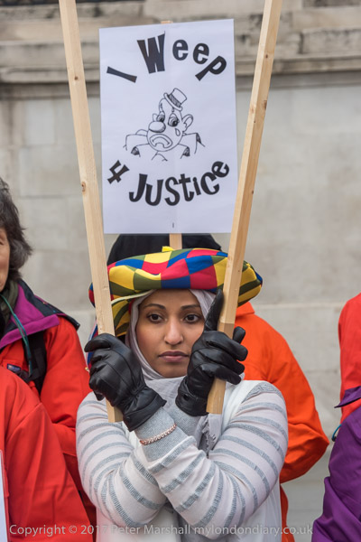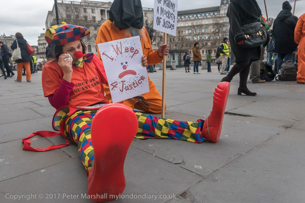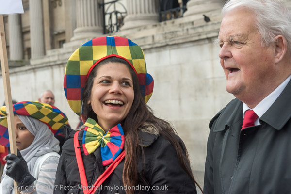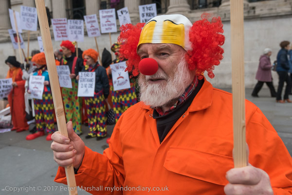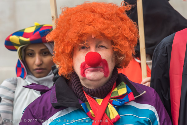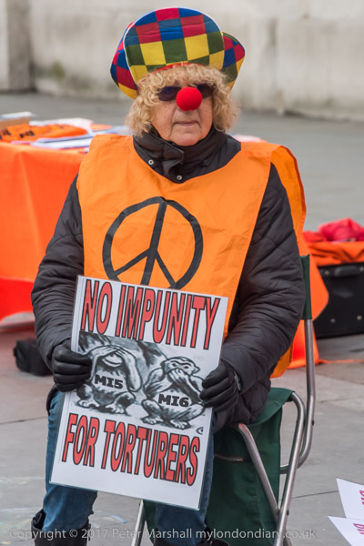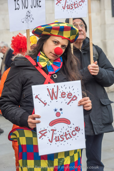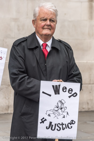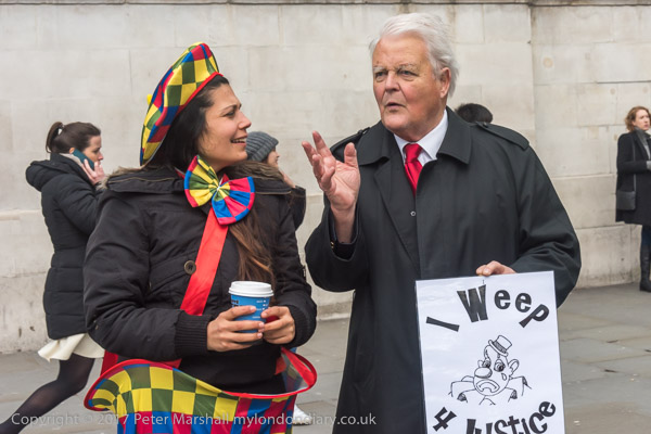 Bruce Kent holds a poster of a clown with the message 'I weep 4 Justice'