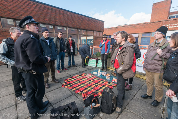 A police officer comes and asks if everyone is OK and wanting to know what the protesters