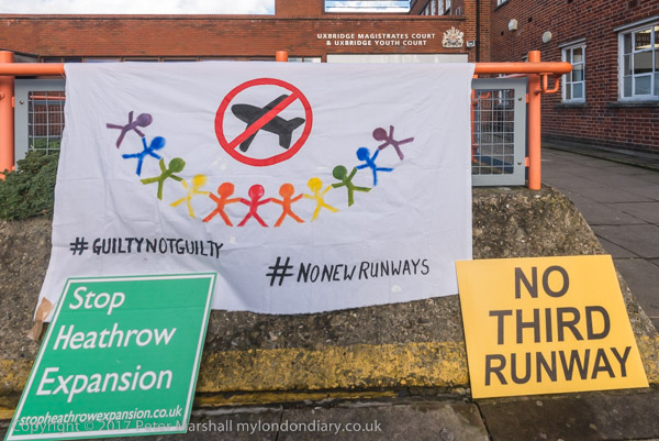 'Stop Heathrow Expansion' and 'No Third Runway' posters with the #GuiltyNotGuilty banner