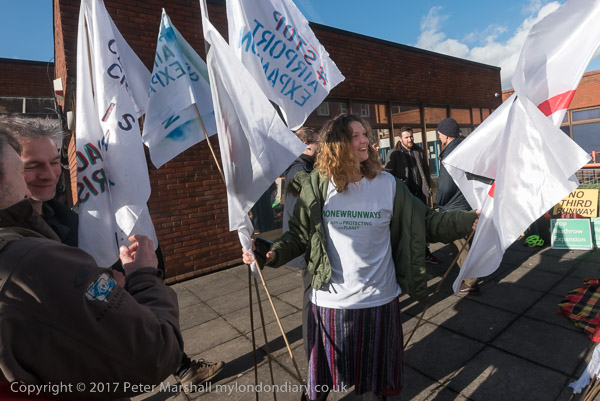 Sophia arrives with flags with the 'No Planes' log and 'Stop Airport Expansion'